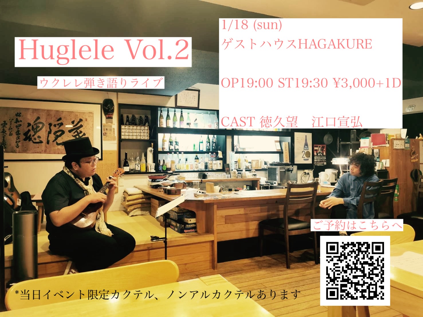 佐賀インターナショナルゲストハウスHAGAKUREが贈る素敵な夜のイベント、ウクレレの弾き語りライブの第2段開催。今回も、素敵なキャスト、徳久望さんと江口宣弘さんの豪華なお二人。